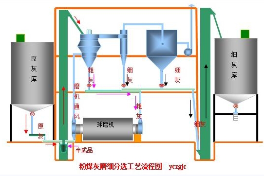 盐城紫光公司联合了国内粉煤灰综合应用 知名的院校南京工业大学材料科学系,成功研制开发了粉煤灰磨细专用的球磨机,将燃煤电厂排放的原灰或者粗灰进行磨细,达到成品灰细度。由于电厂经过分选的粉煤灰粗灰里还含有大部分细灰,在球磨机前增设一台分选设备,先将粗灰里的细灰选出来,粗灰回球磨机进行研磨,研磨过的粉煤灰再次进行分选,分选后将粗灰再次重新返回球磨机进行超细研磨,整个系统形成闭路循环粉磨,生产出能配制高性能砼的 掺合料(微粉),大大提高了粉煤灰综合利用的经济效益,能够实现粉煤灰的全部综合利用。